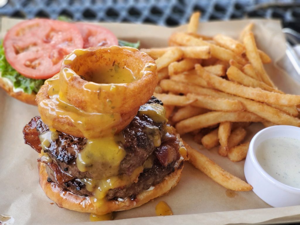 2 grilled 6oz burgers with mayo, lettuce, tomato, bacon, fried onion rings and beer cheese on a brioche bun