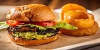 A grilled chipotle-black bean burger with mayo, lettuce, tomato and avocado on a brioche bun