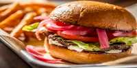 Grilled 6 oz burger with mayo, lettuce, tomato pickled Red Onion on a brioche bun